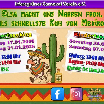 Ola Amigos, es ist endlich wieder soweit, im Rittergutssaal ist wieder Fasching! Unsere mexikanische Saison startet am 15.11.2025 mit der Saisoneröffnung! Dieses Jahr mit einem besonderen Highlight, die Band Simultan spielt nach unserem Programm zum Tanz auf! Die Karten für diesen Abend können ab sofort unter unsere Tickethotline reserviert werden!Das Motto der neuen Saison lautet: „Elsa macht uns…