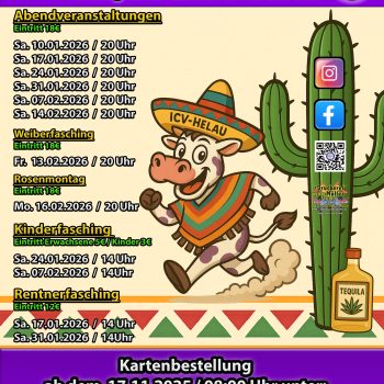 Termine Rentnerfasching: 17.01.2026 und 31.01.2026 Termine Kinderfasching: 24.01.2026 und 07.02.2026 Einlass jeweils 13:00 Uhr, Beginn 14:00 Uhr ICV Helau!